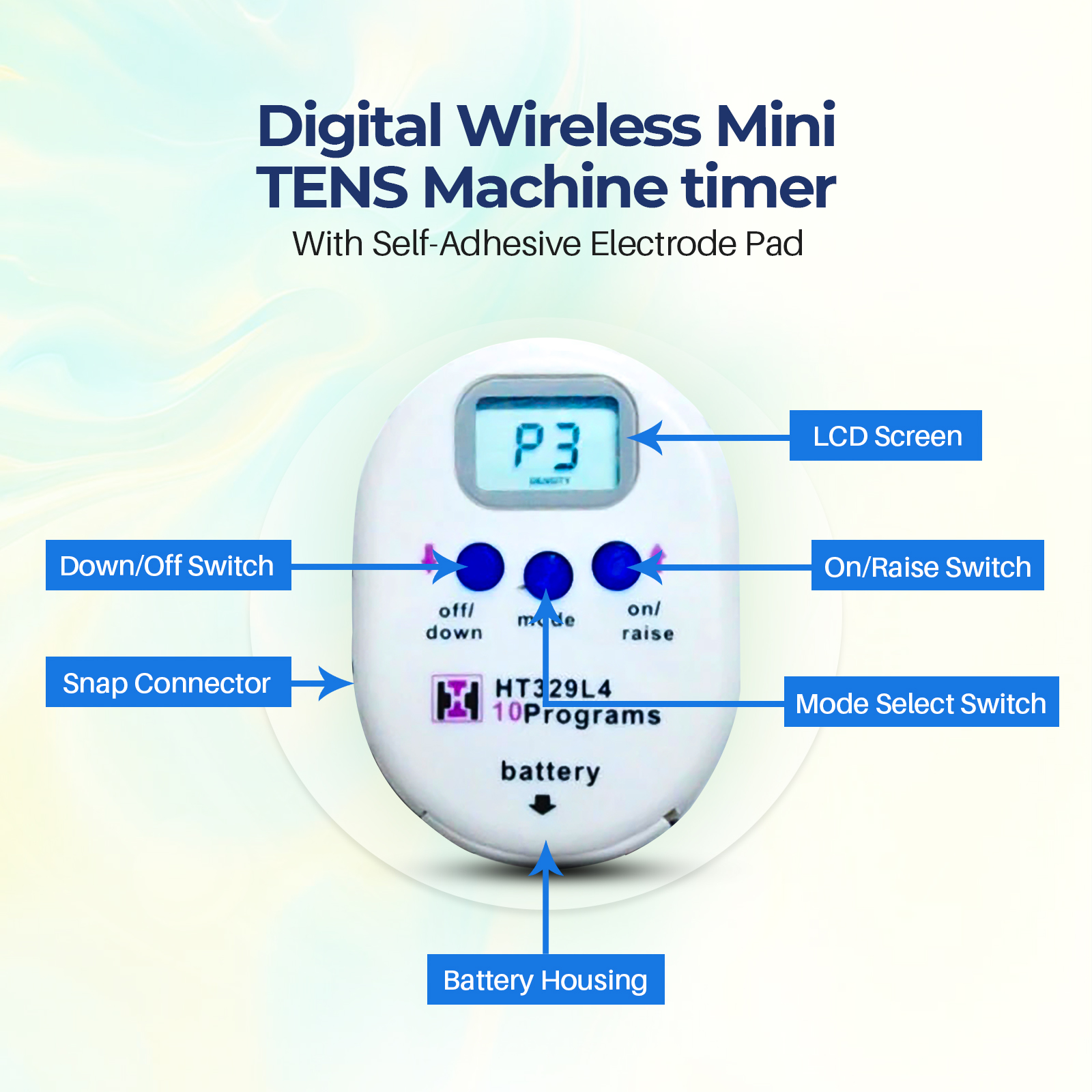 This compact digital mini TENS machine offers both TENS and EMS programs for effective pain relief, massage, and muscle toning. Completely wireless, it attaches directly to self-adhesive electrode pads for easy and discreet use. Lightweight and portable, ideal for home, office, or travel. CE-approved and safe for regular use. Perfect for relieving back pain, arthritis, period cramps, muscle strains, and more.