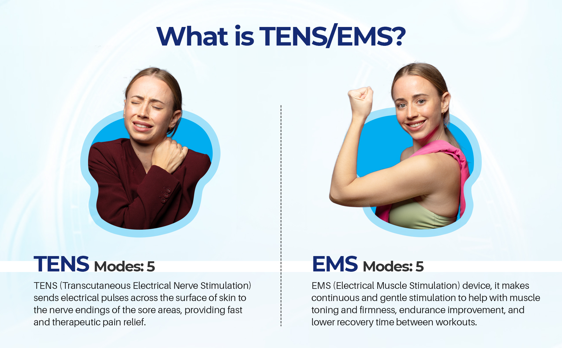 TENS (Transcutaneous Electrical Nerve Stimulation) relieves pain by stimulating nerves, while EMS (Electrical Muscle Stimulation) strengthens, tones, and stimulates muscles.